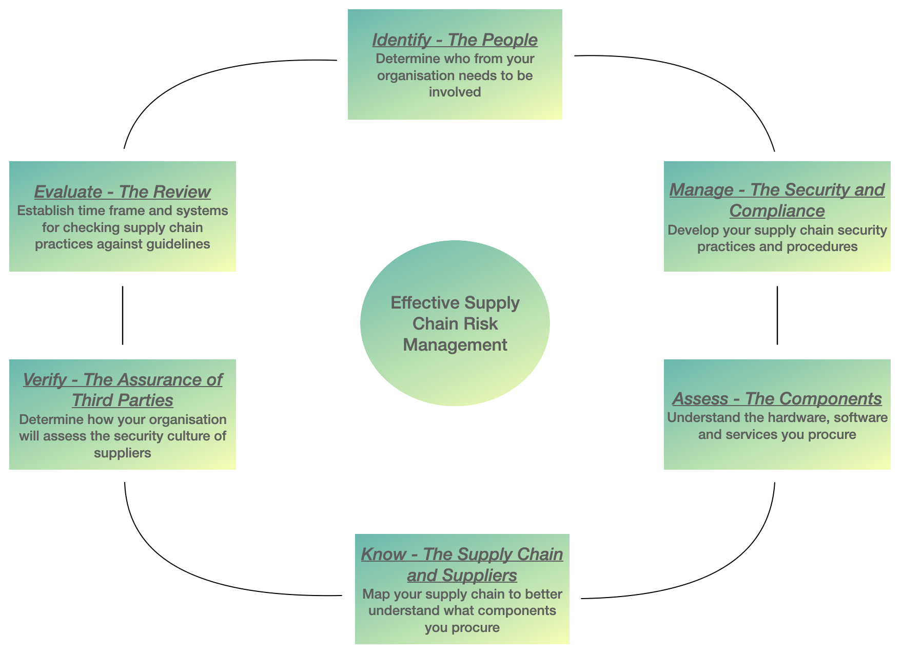 Design and develop you supply chain policies and procedures that can help you address governance, cyber security, third-party security, compliance management. Take reference from sector and industry best practices such NIST on how to conduct supply chain risk management. Involve senior leadership to to drive top-down culture in your organisation.